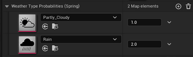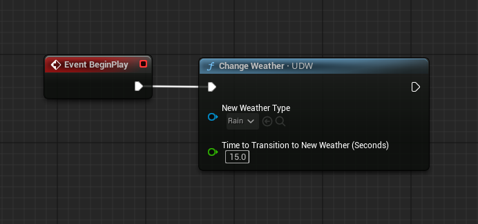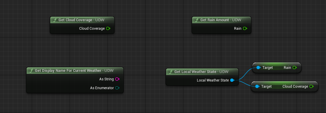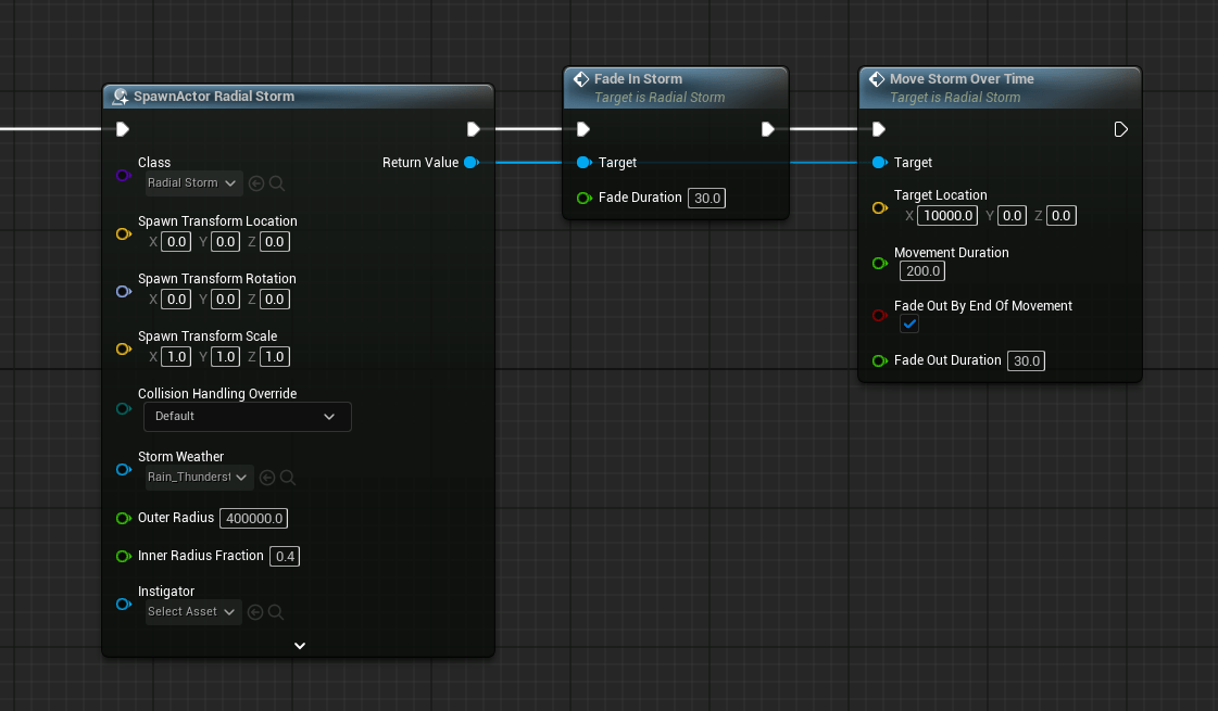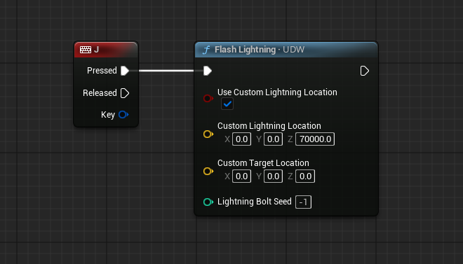 On UDW, the niagara components for the weather particles and obscured lightning are controlled mainly from the update functions. The lightning flashes are spawned from the Lightning Flash graph.