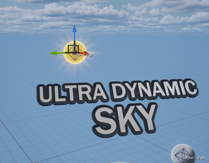 Drag the Ultra Dynamic Sky actor into your scene from the Blueprints folder. You should see the sky with its default configuration of daytime lighting with volumetric clouds.