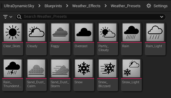 1. Sky Atmosphere - The system will use unreal's sky atmosphere rendering system to imitate correct atmospheric scattering. The settings for this can be further adjusted from the Sky Atmosphere category.